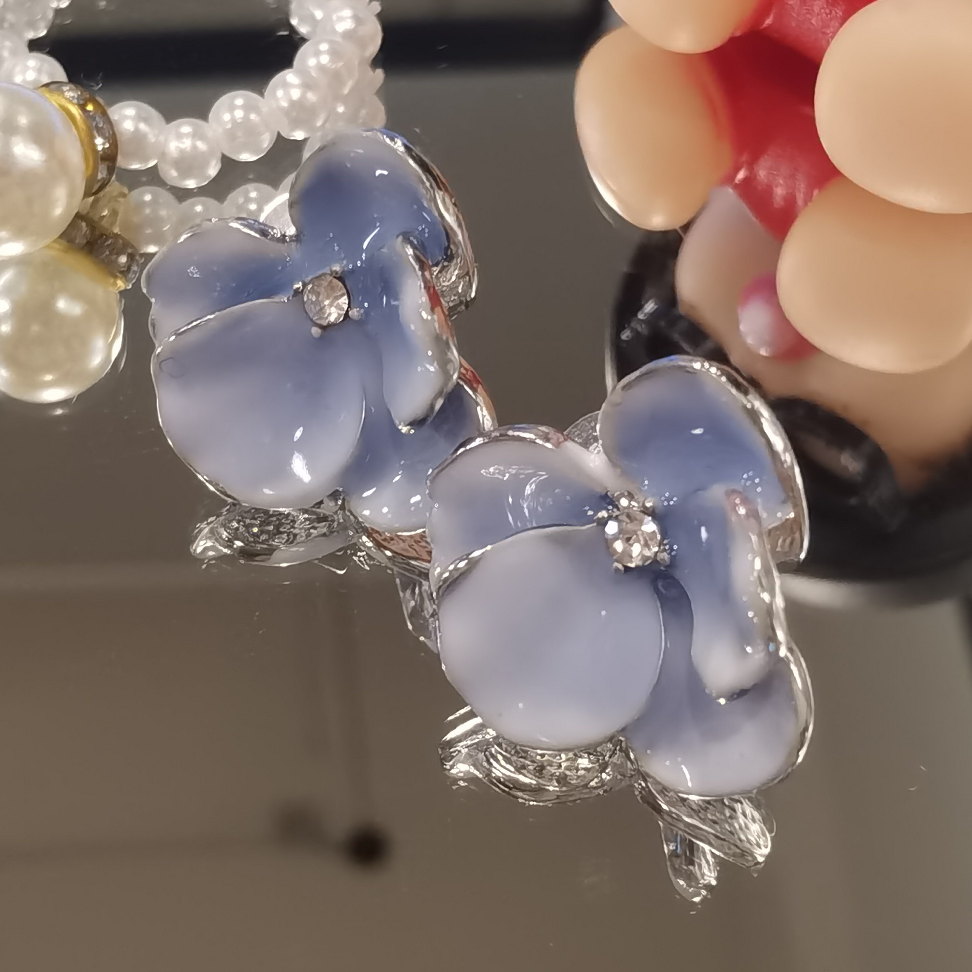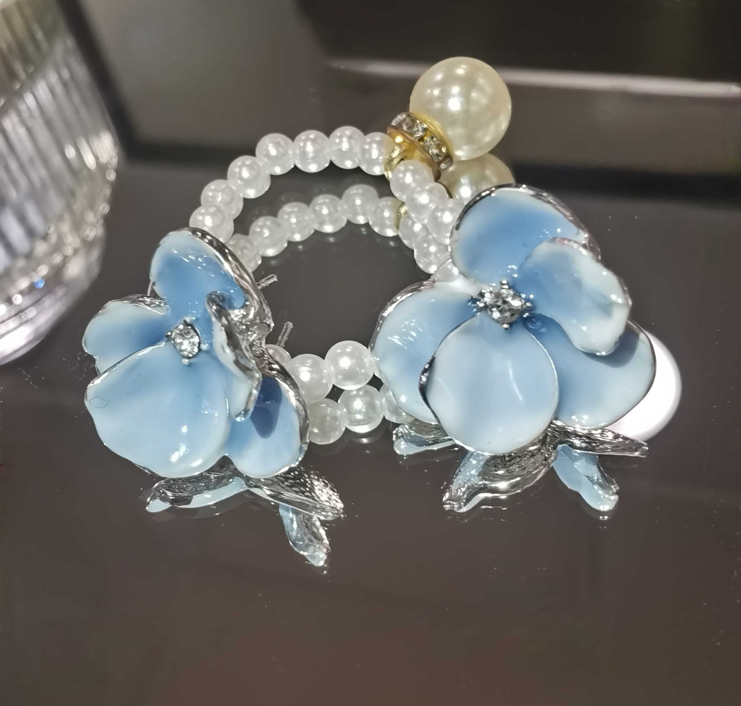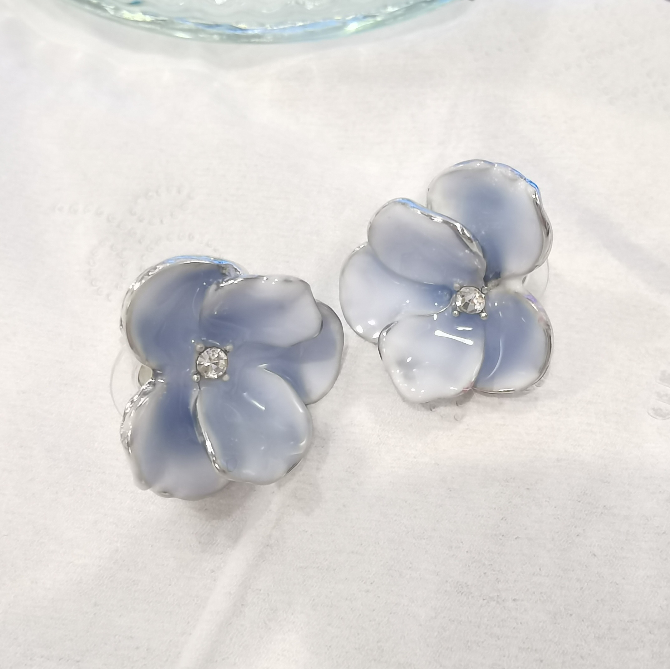 Delicate Petals Design, Sky-blue Hue, 925 Silver, Mirror Drip Glaze with rhinestone